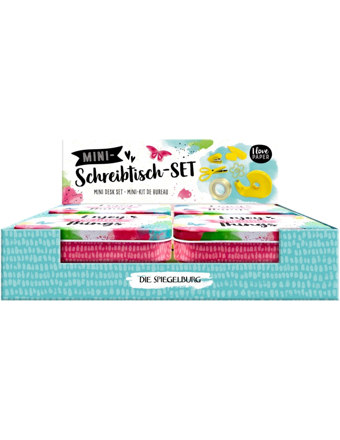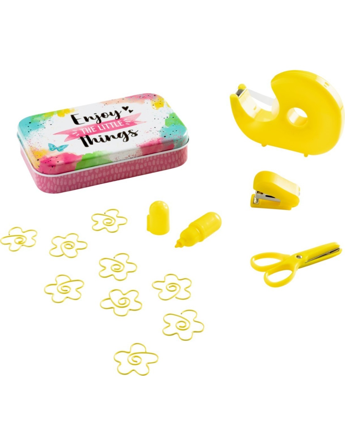 Voor meer orde op het bureau: mini bureauset in een bedrukte metalen doos. De set bestaat uit: mini schaar, mini highlighter, mini tacker incl. een rij tacker naalden (nr. 10), tape dispenser, transparante tape rol (1,2cm x 15m, Ø 2,5cm) en 10 paperclips.