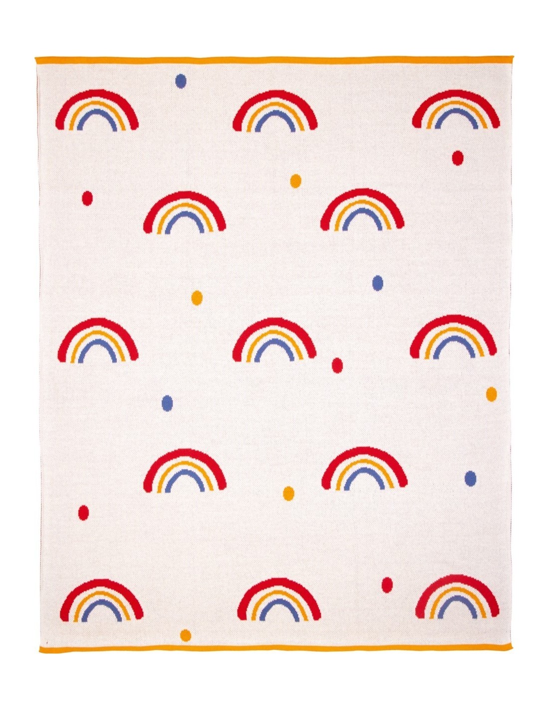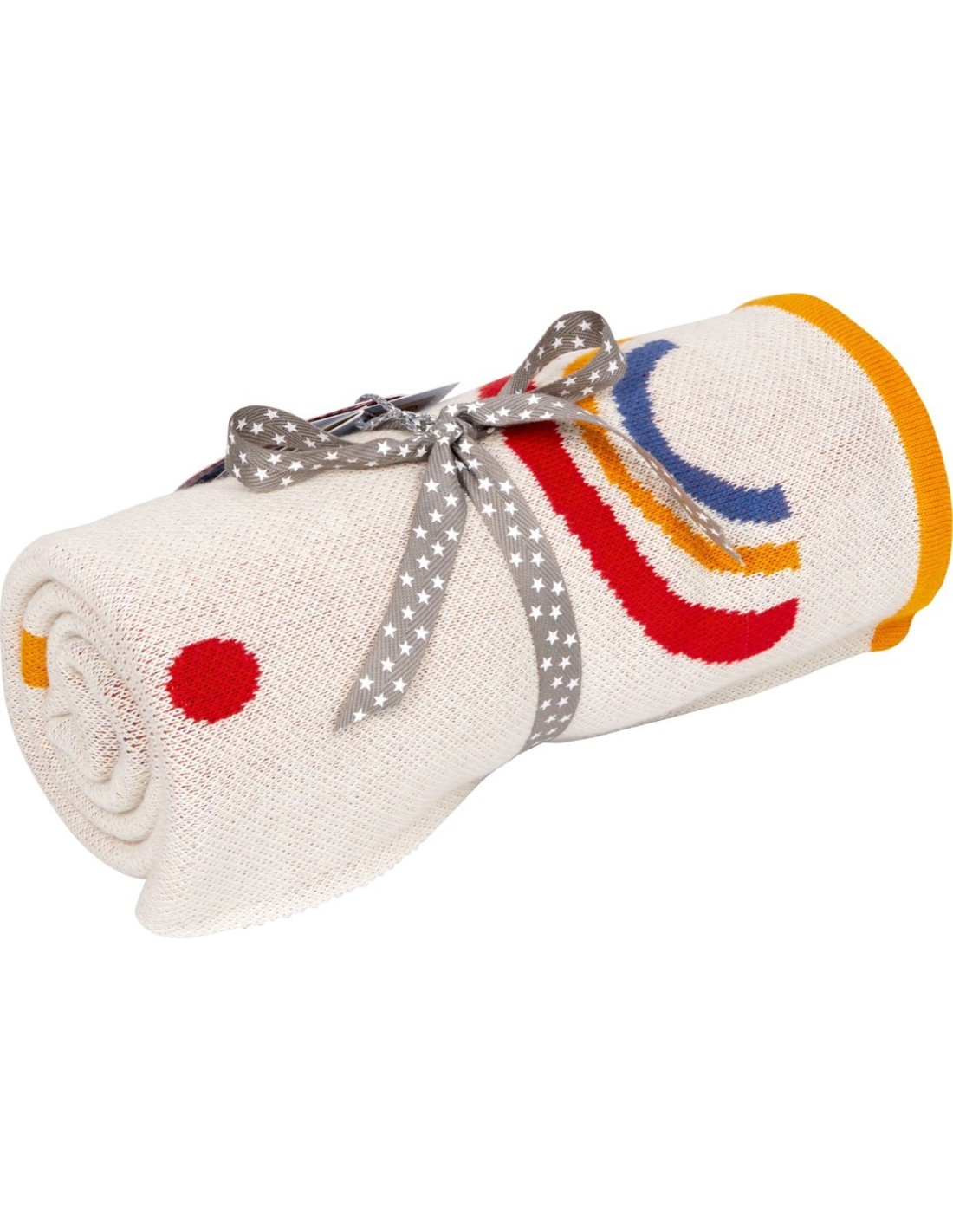 Knuffelzacht gebreide deken in een kleurrijk regenboogdessin van BabyGlück. Geeft geborgenheid en warmte. Een prachtig cadeau voor alle pasgeborenen.