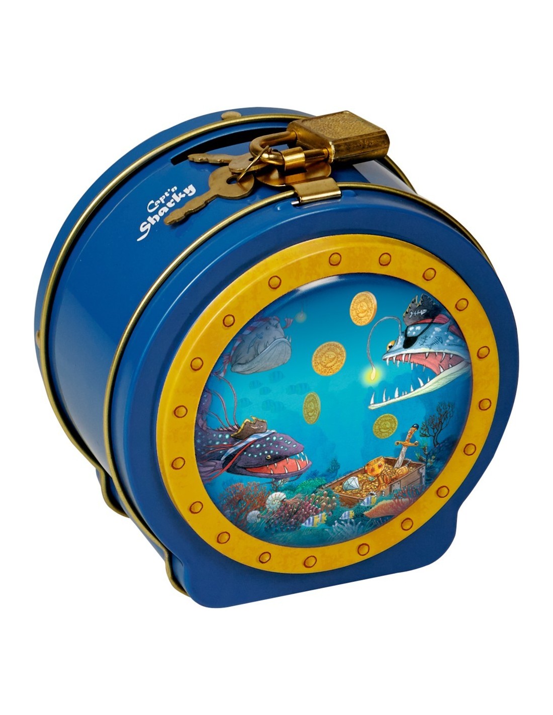 Kinderen zouden het liefste alles wat ze zien en mooi vinden meteen kopen. Dit is niet anders voor Capt'n Sharky en zijn vrienden. Maar iedereen moet leren omgaan met geld. Dit geldt ook voor sparen. Met deze metalen spaarpot van Capt'n Sharky wordt sparen leuk en in het blikje past niet alleen geld, maar ook andere kleine schatten. Bovendien ziet de spaarpot er sipercool uit. Metalen spaarpot met slot en 2 sleutels.