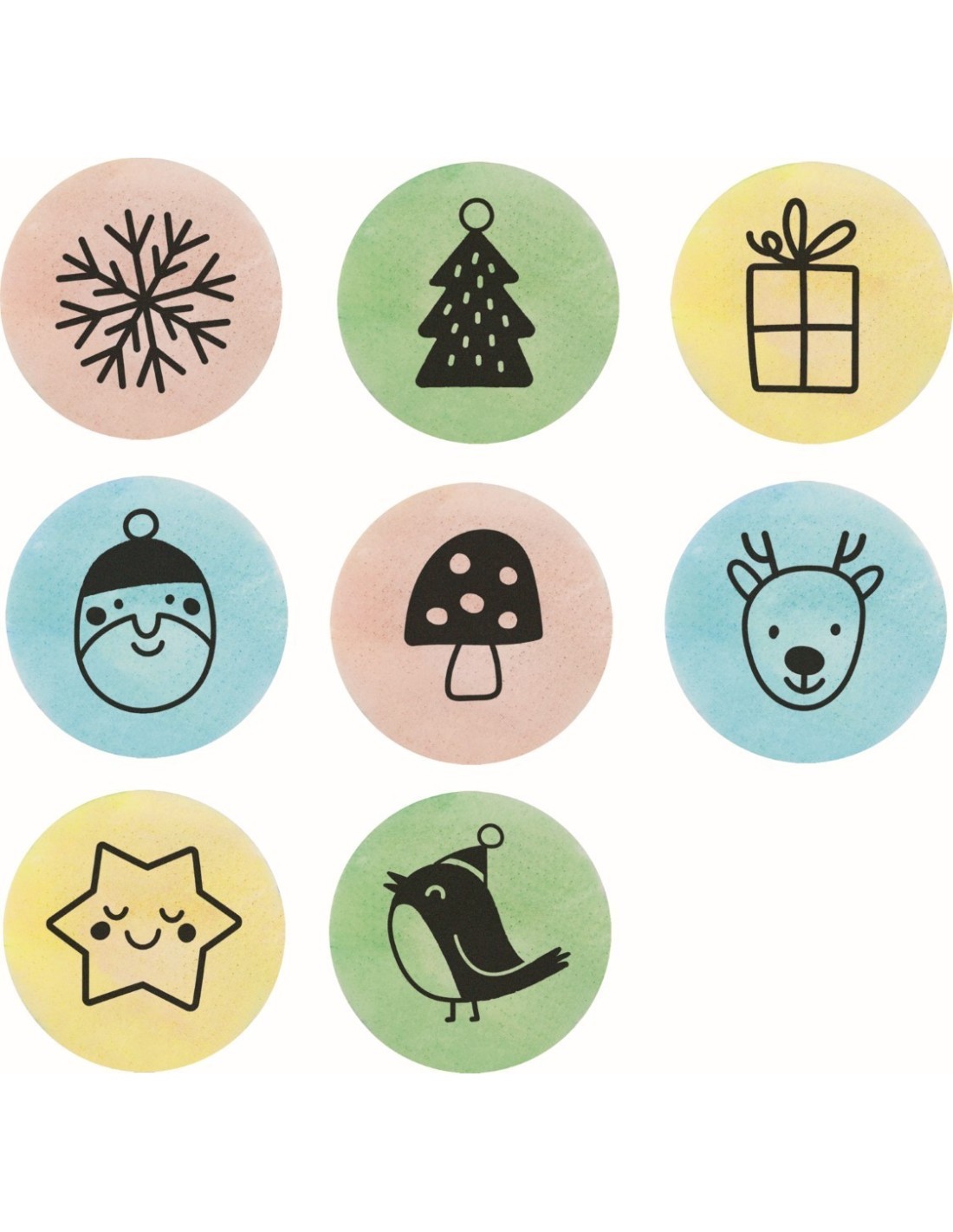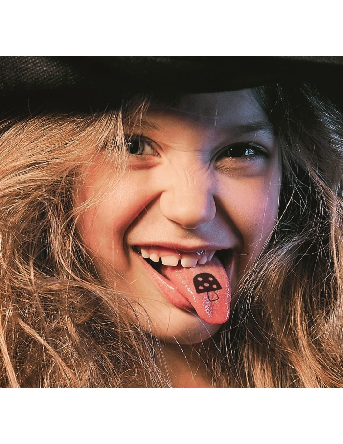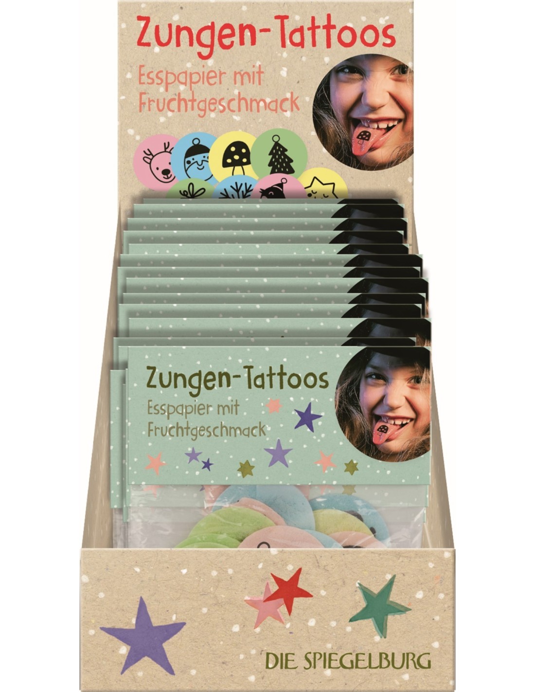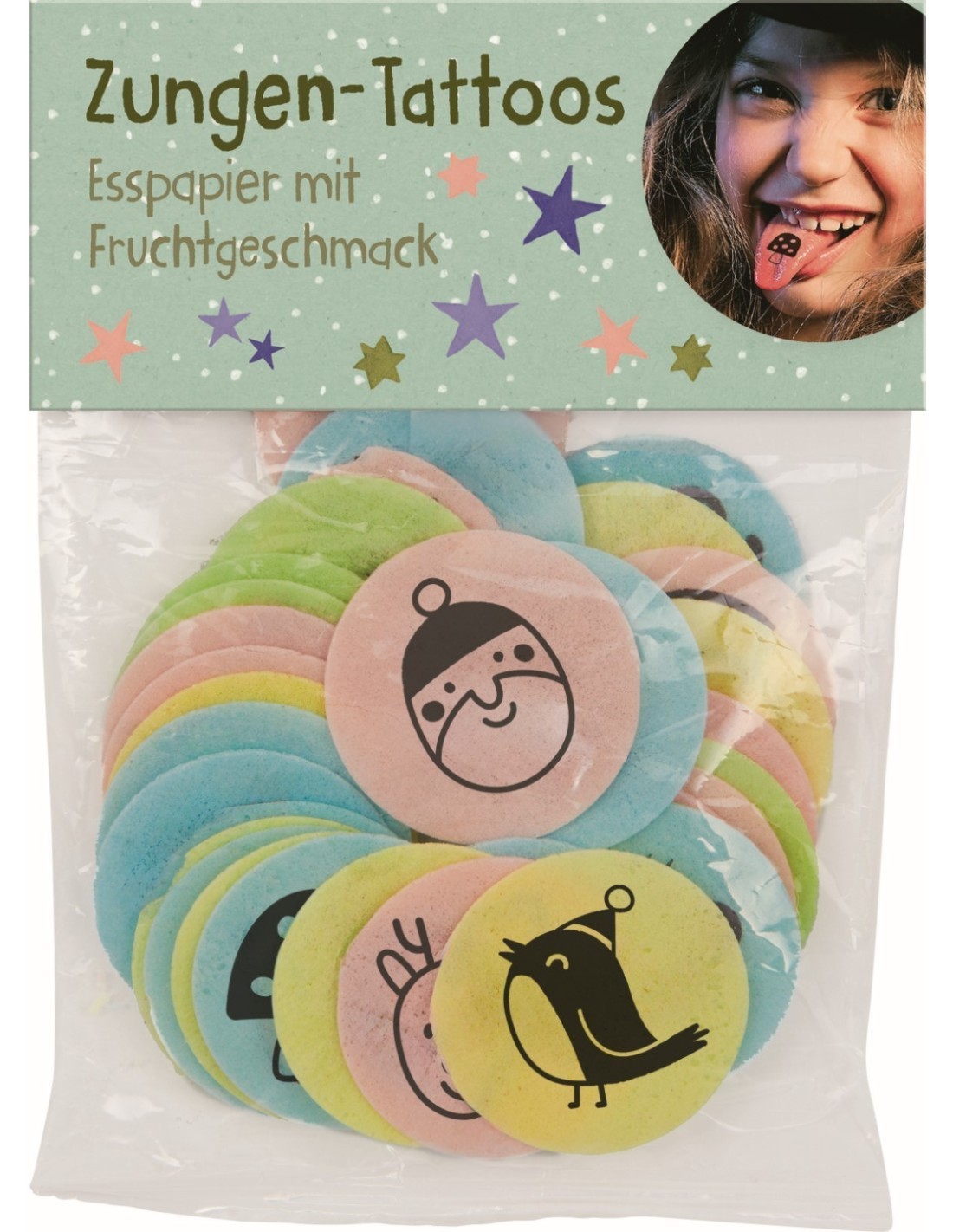set of approx. 30 colourful edible paper wafers in 8 designs with tattoo print made from food colouring / 4 flavours: Pink (strawberry), yellow (orange), blue (tutti frutti), green (apple) / Simply place on the tongue, press briefly, remove, done!