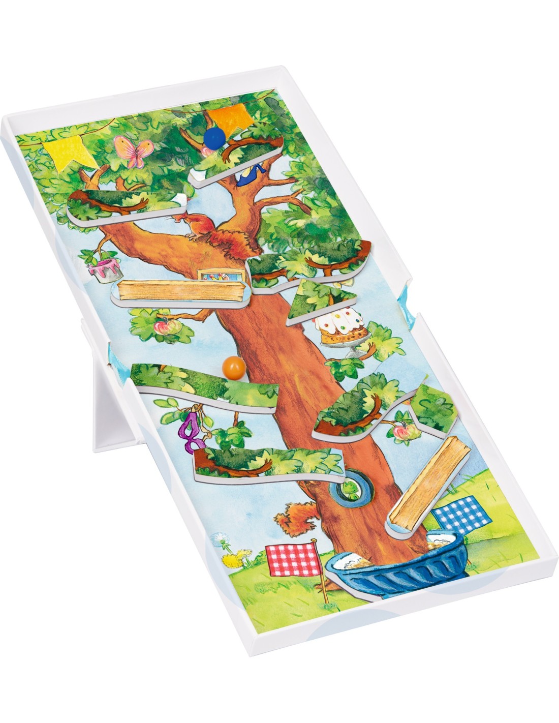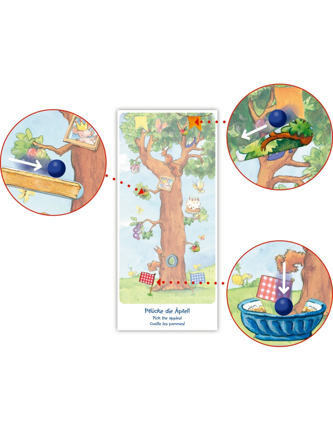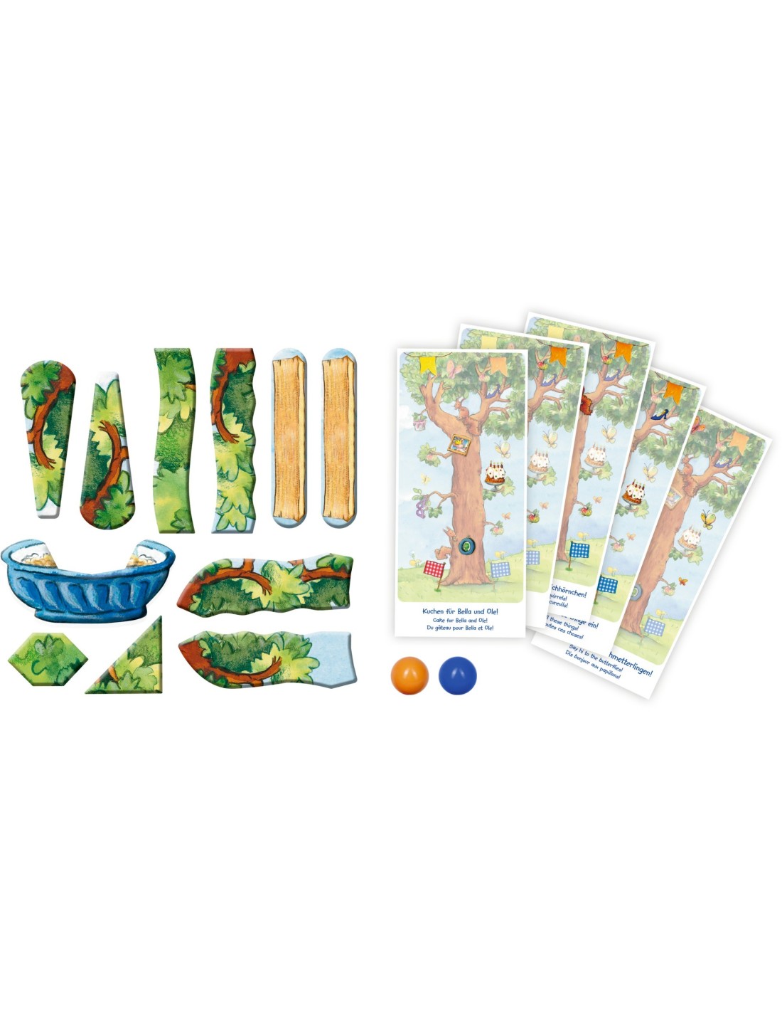 11 magnets, 2 plastic marbles, 5 playing cards for individual creation of your own marble run. The obstacles are magnetic and can be re-arranged. Additional game is explained on the playing cards. The marble run is foldable for easy storage and transport. For kids aged 3 years and older.