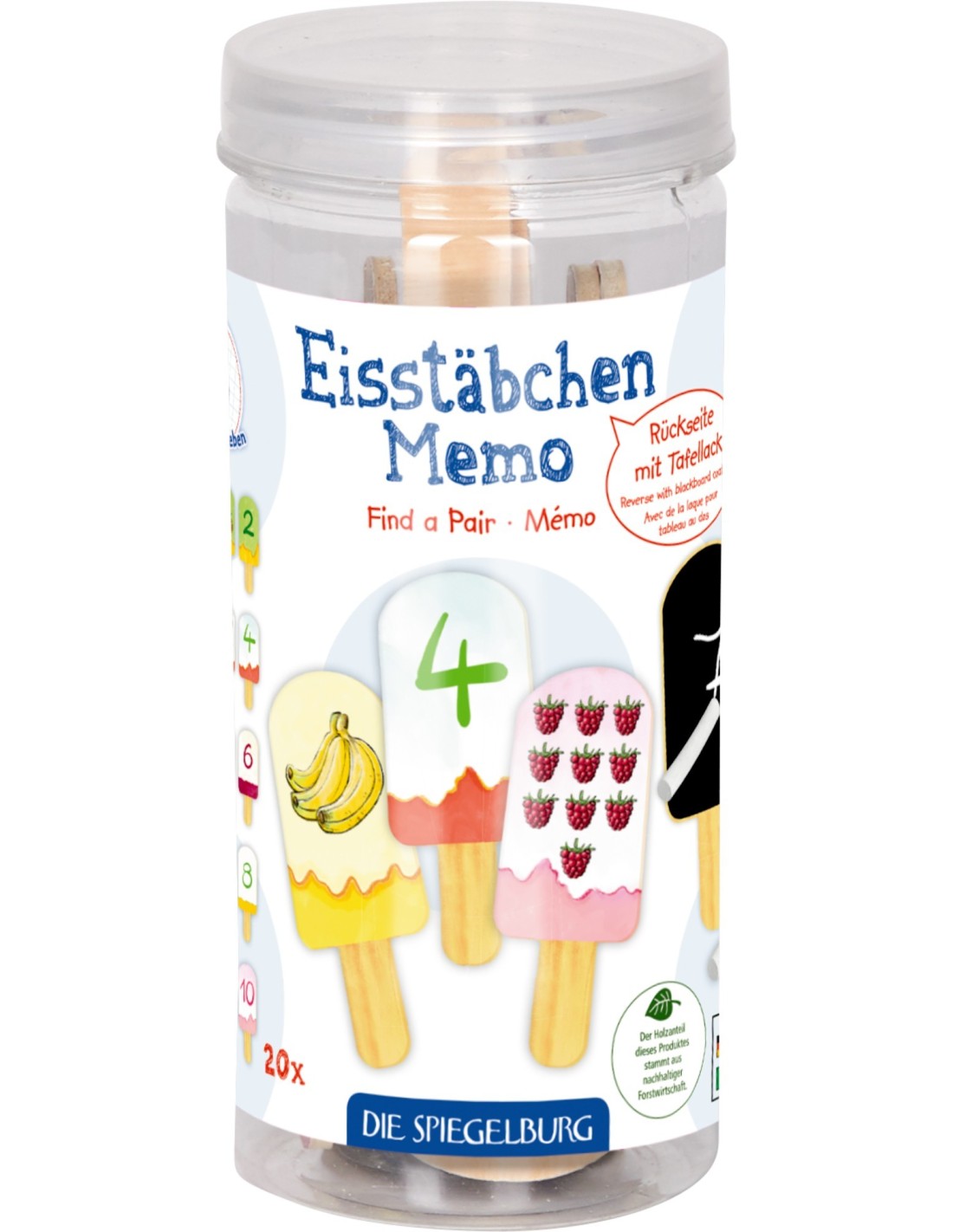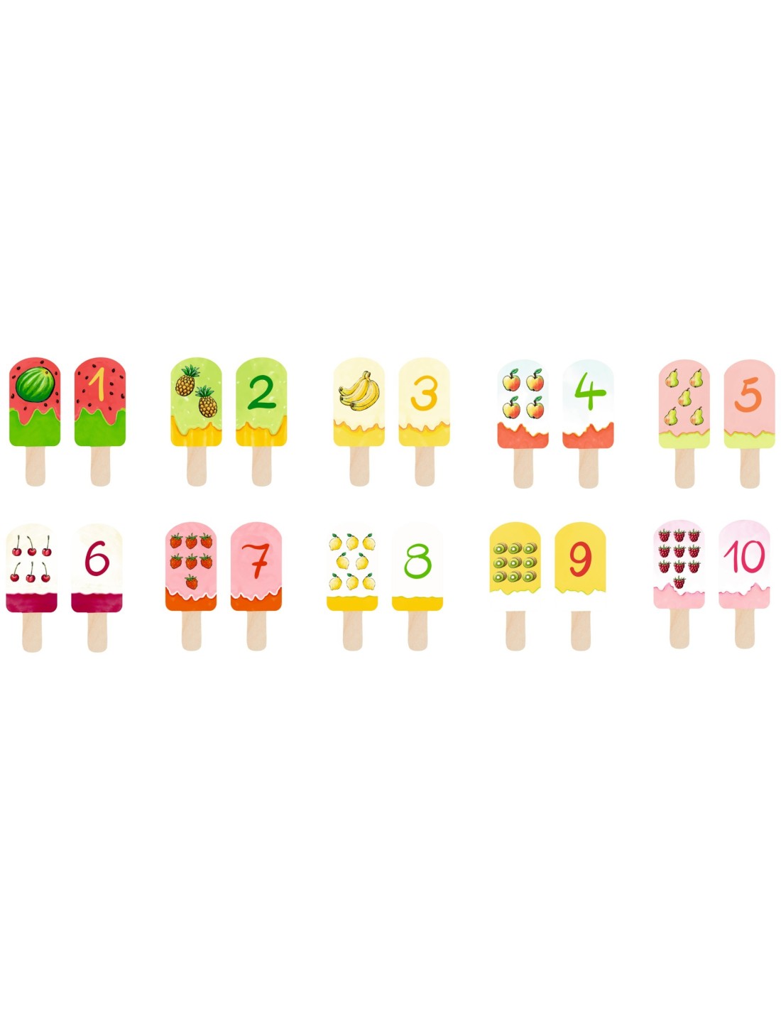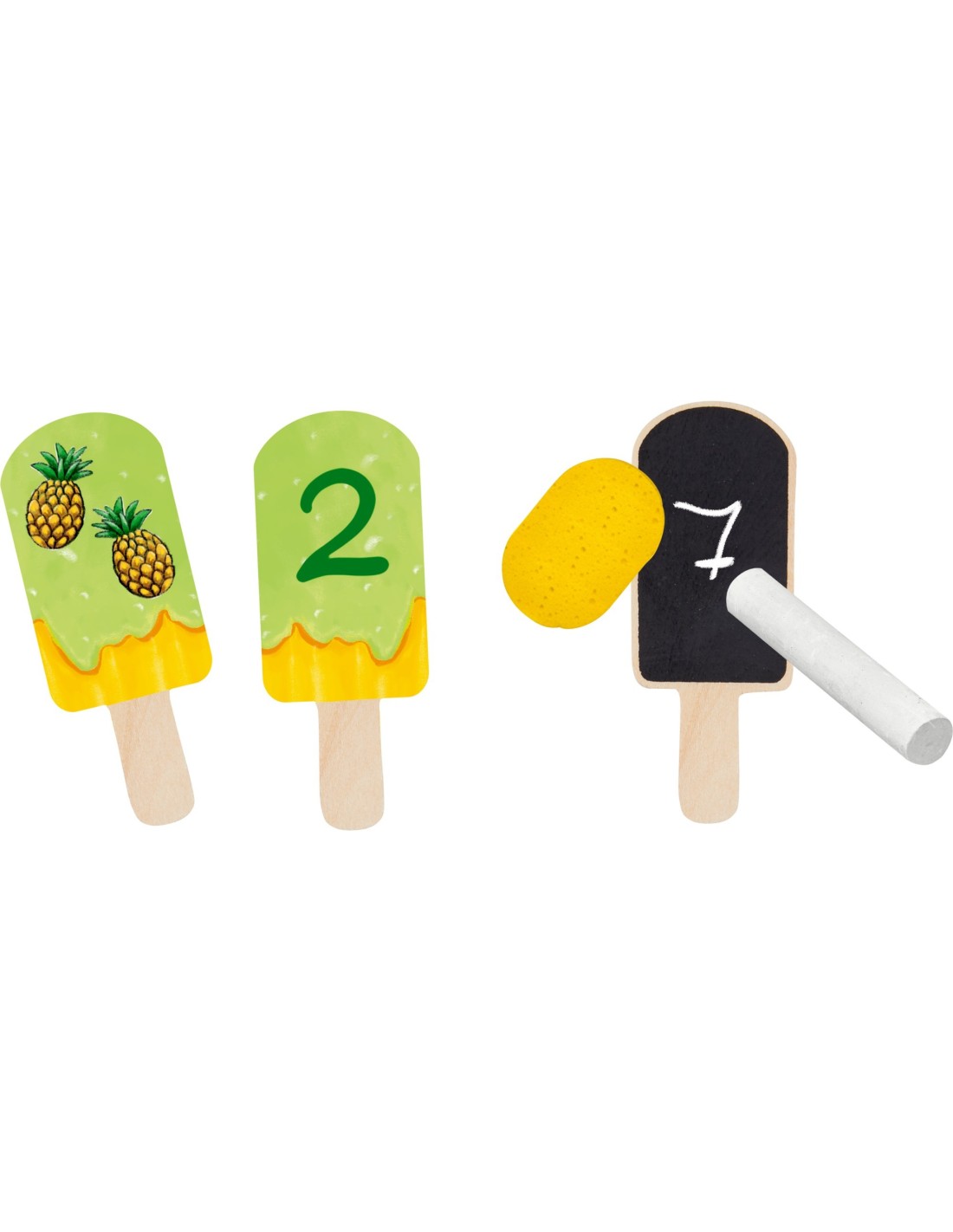 10 ice lolly shaped wooden memo cards with chalkboard back. With chalk and sponge. Play memo game and at the same time learn to write numbers or draw on the back.