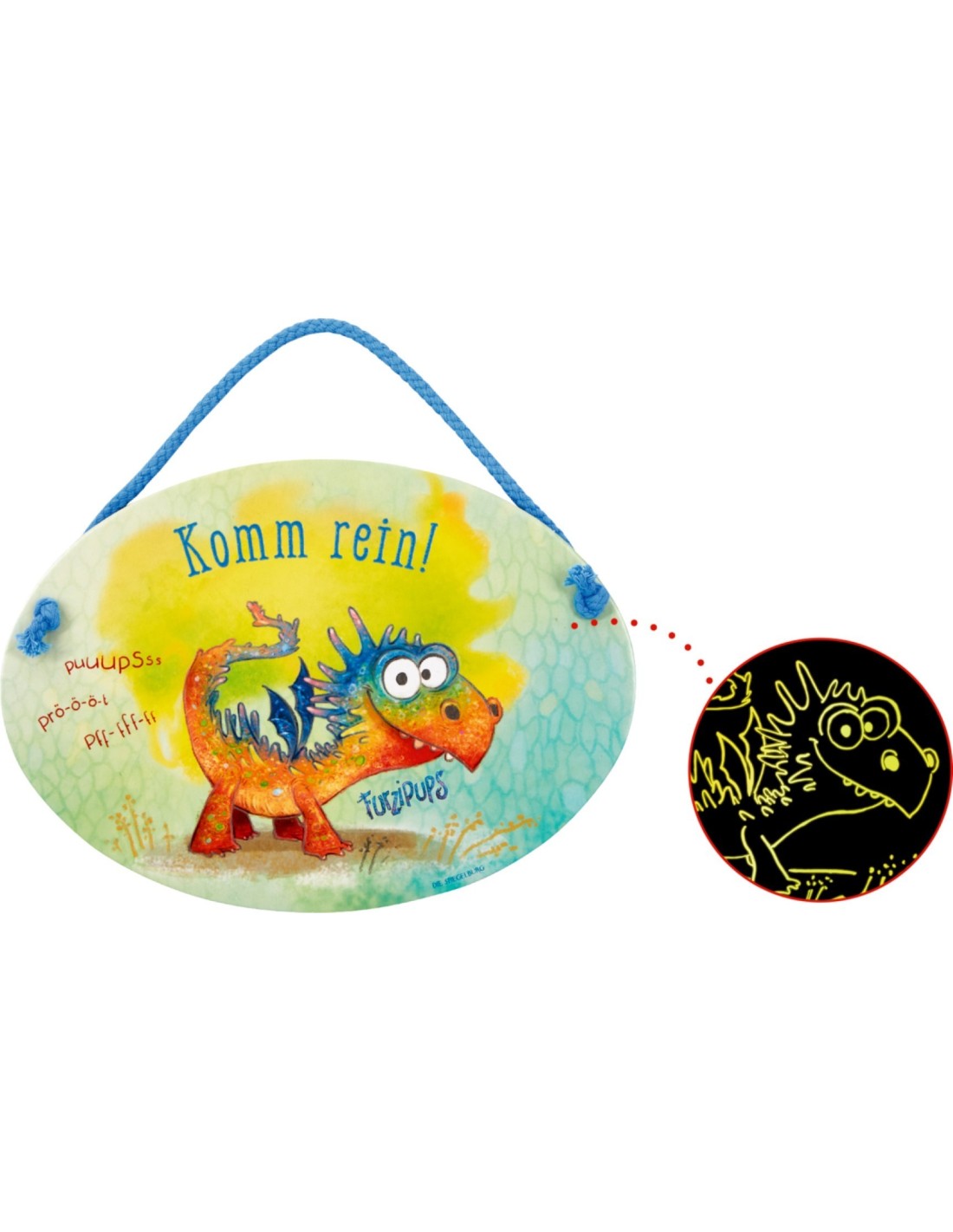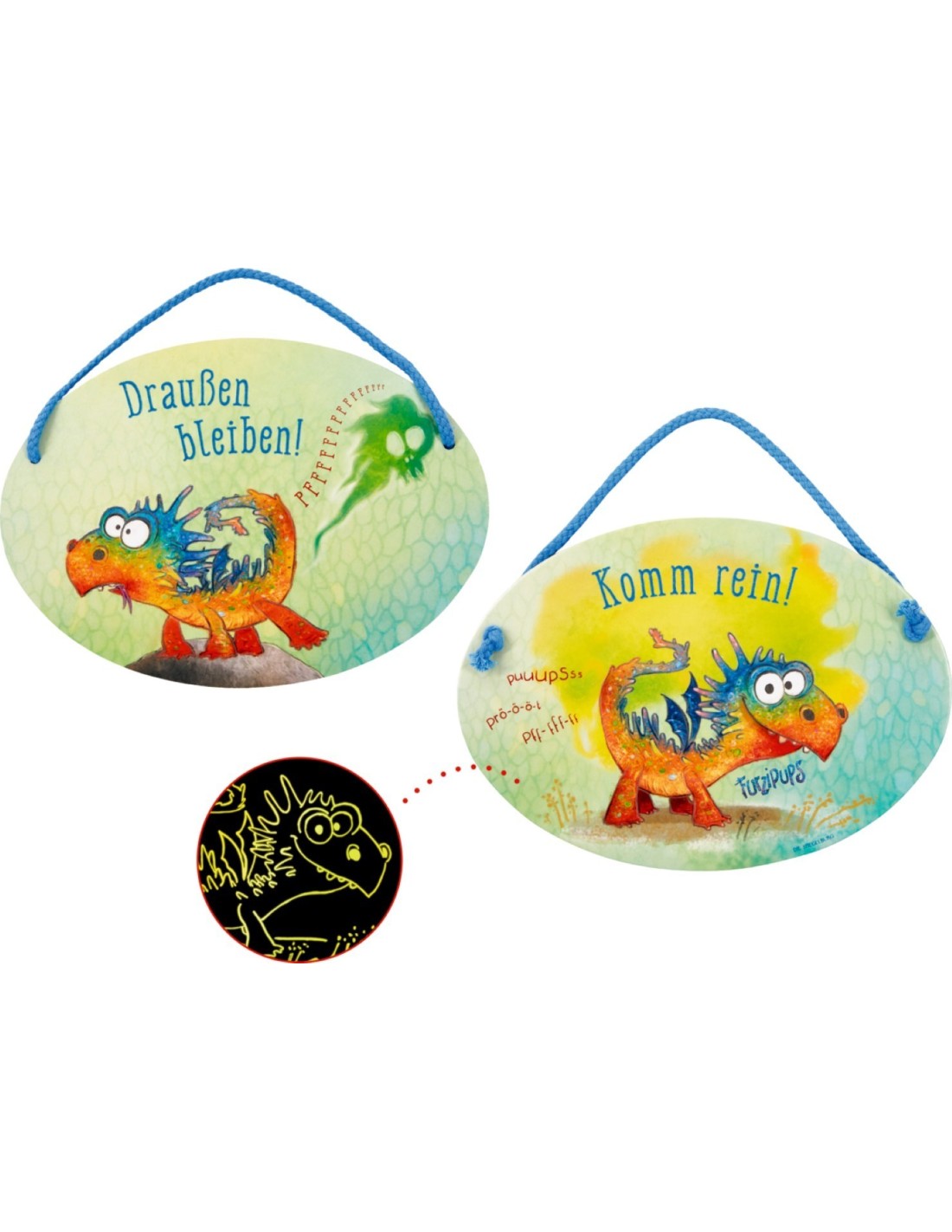 Omkeerbaar deurbordje met de Furzipups-draak en de instructies "Kom binnen" / "Blijf buiten". Met een cool glow-in-the-dark effect.