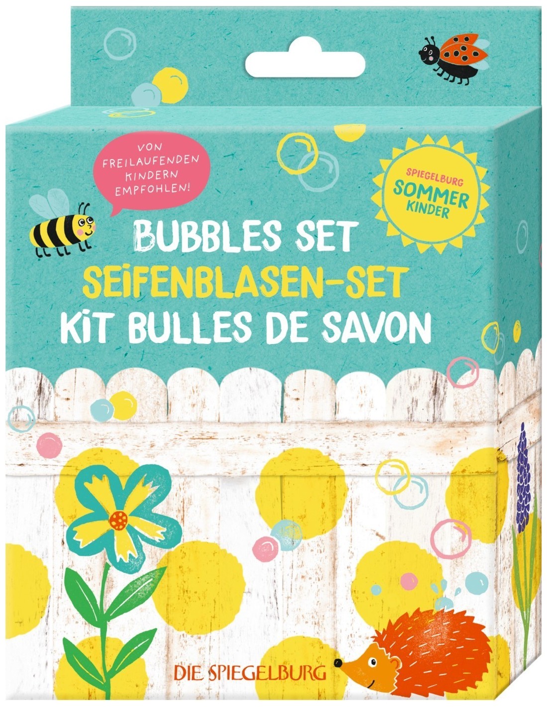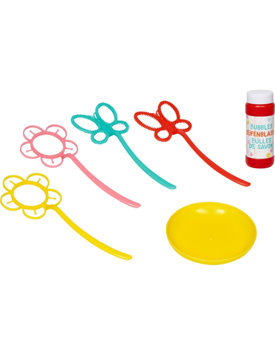 Zomer, zon, plezier met kleurrijke, sprankelende zeepbellen! De set bestaat uit een flesje met zeepbellenvloeistof (60 ml), een schaaltje en 4 blaasstokjes in de vorm van bloemen en vlinders. Gewoon zeepsop vullen en klaar!