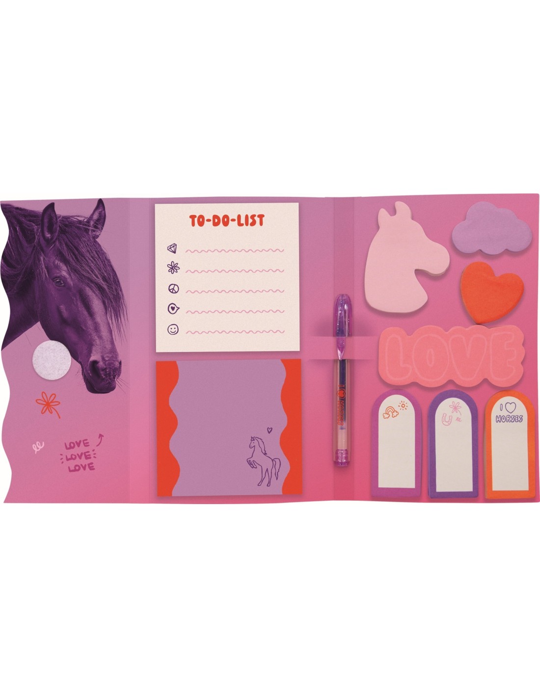 set of 9 printed sticky note pads with 40 sheets each and mini gel pen