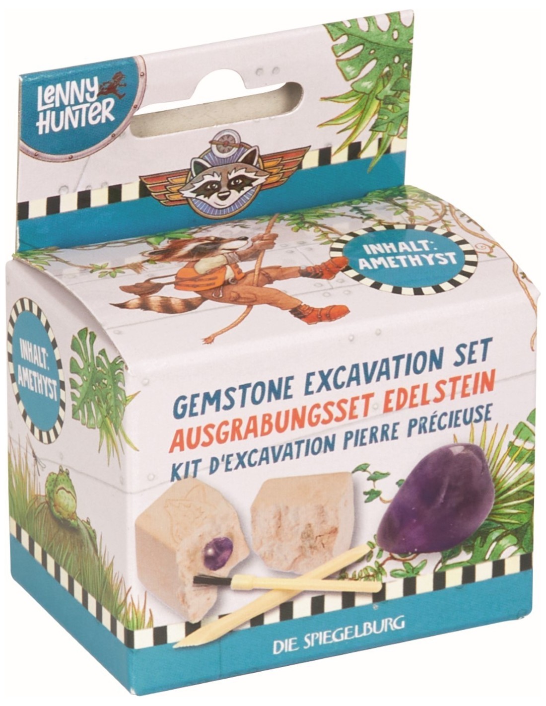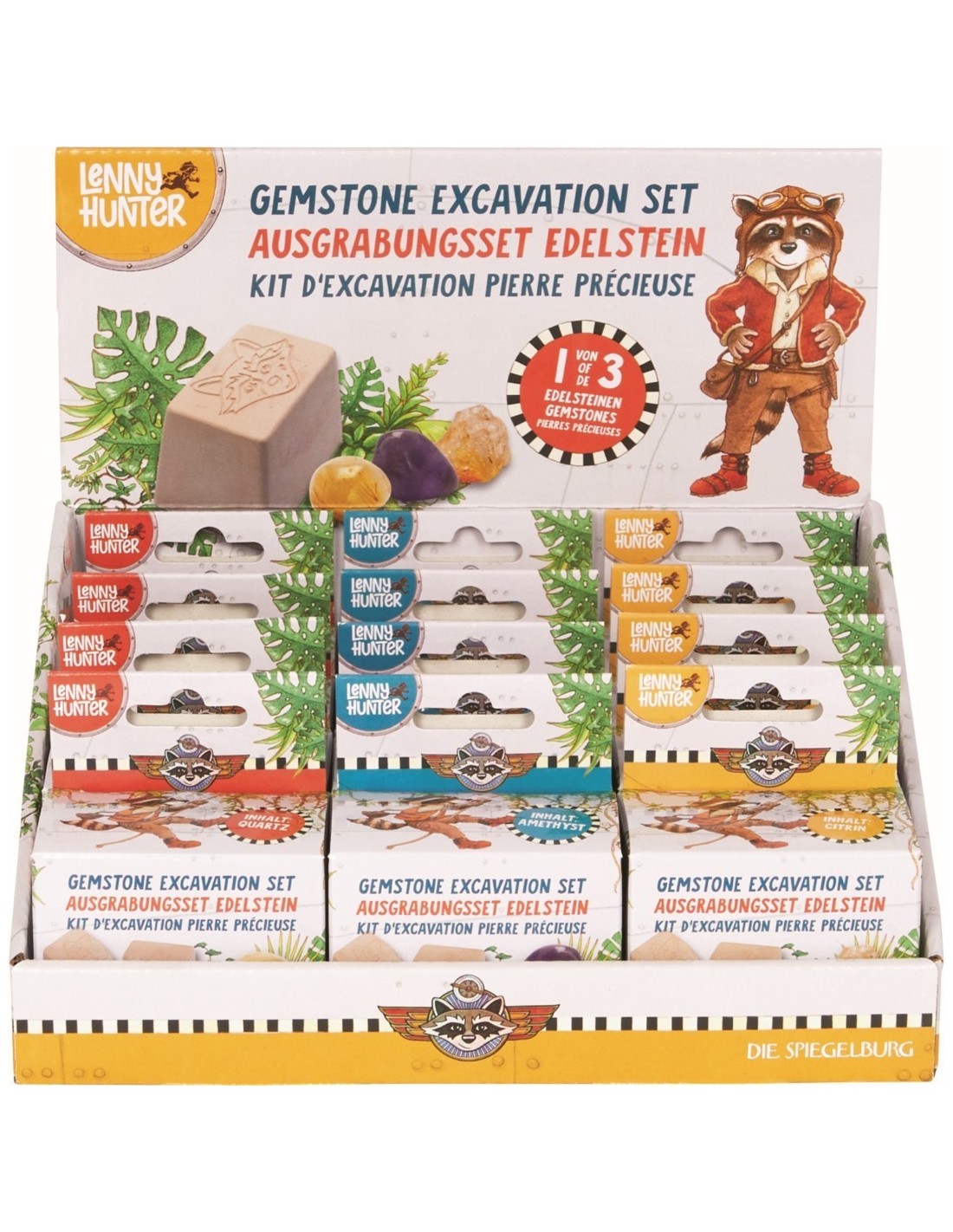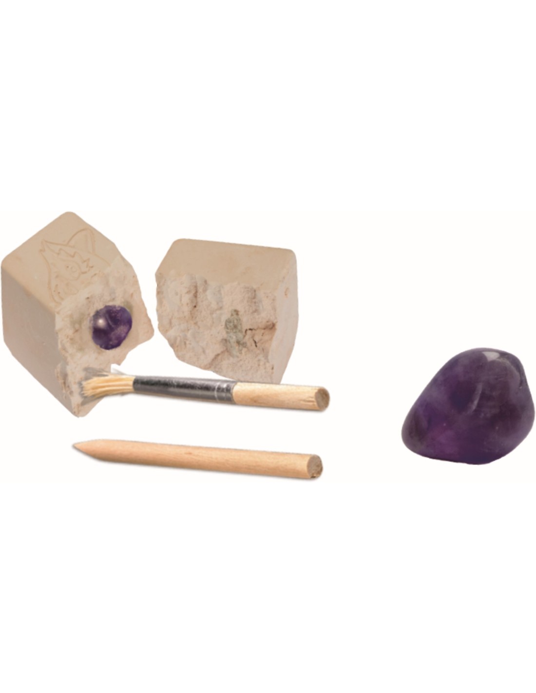 Deze set bevat een glinsterende edelsteen (kwarts, citrien of amethist) verborgen in een krijtblok dat stuk voor stuk kan worden onthuld.