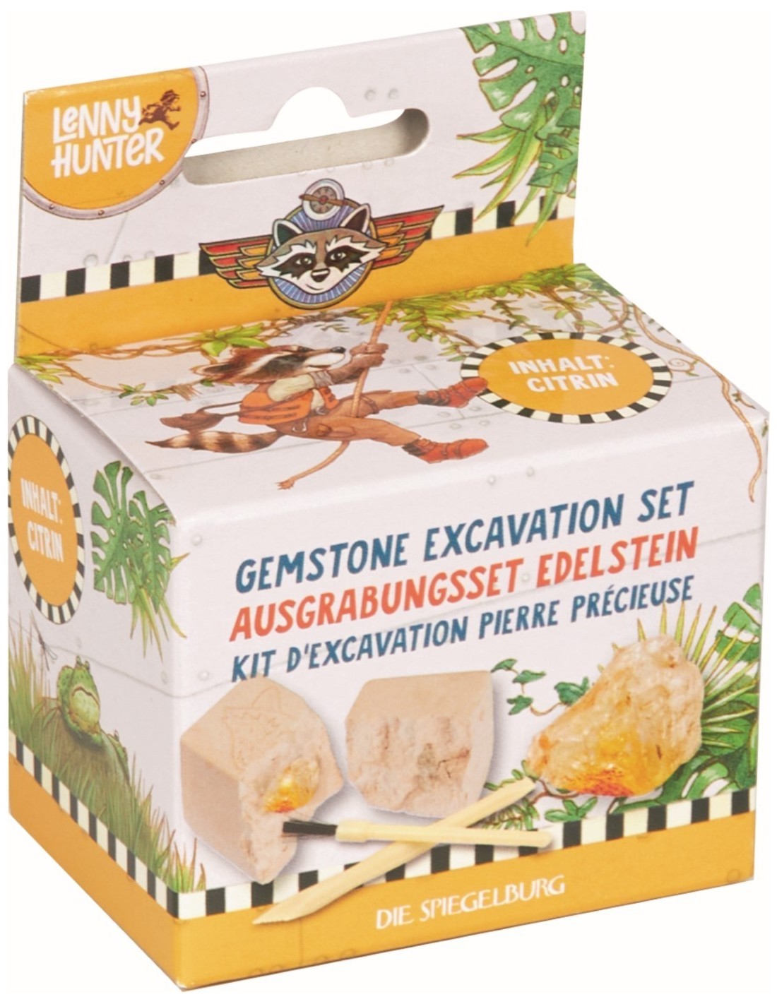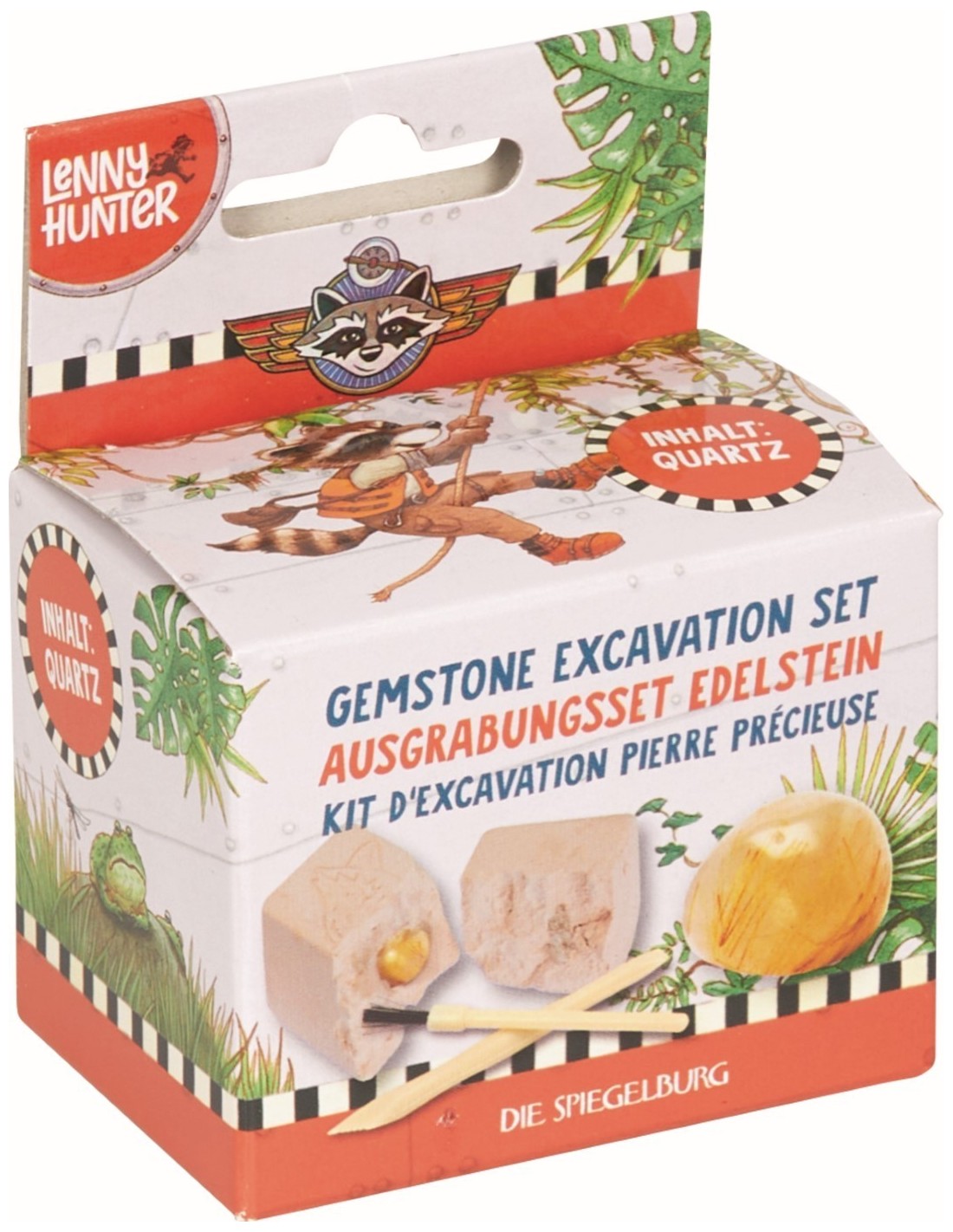 Inhoud: een edelsteen (kwarts, citrien of amethist) in een krijtblok, graafgereedschap