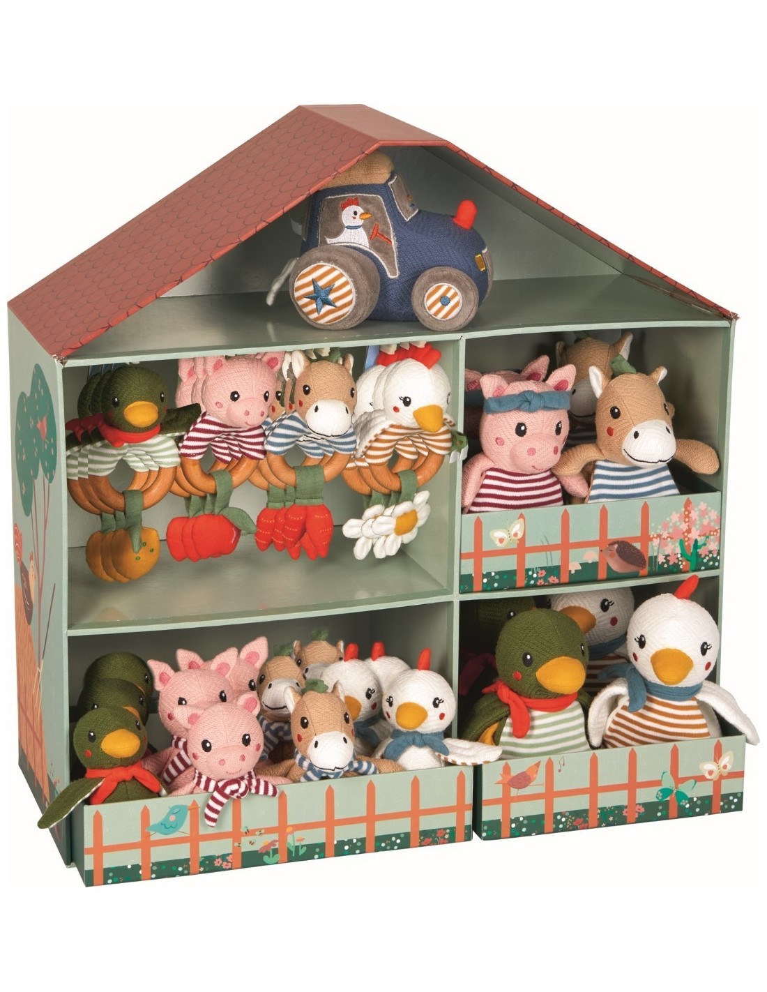Knuffels1 x cuddly toy with cuddle comforter horse (21845), set of 2 cuddly toy with cuddle comforter pig (21846), set of 2 cuddly toy with cuddly comforter chicken (21847), set of 2 cuddly toy with cuddle comforter duck (21927), set of 2 crackling toy horse (21848), set of 3 crackling toy pig (21849), set of 3 crackling toy chicken (21850), set of 3 crackling toy duck (21928), set of 3 wooden ring rattle horse (21851), set of 3 wooden ring rattle pig (21852), set of 3 wooden ring rattle chicken (21853), set of 3 wooden ring rattle duck(21929), set of 3 activity tractor (21939),