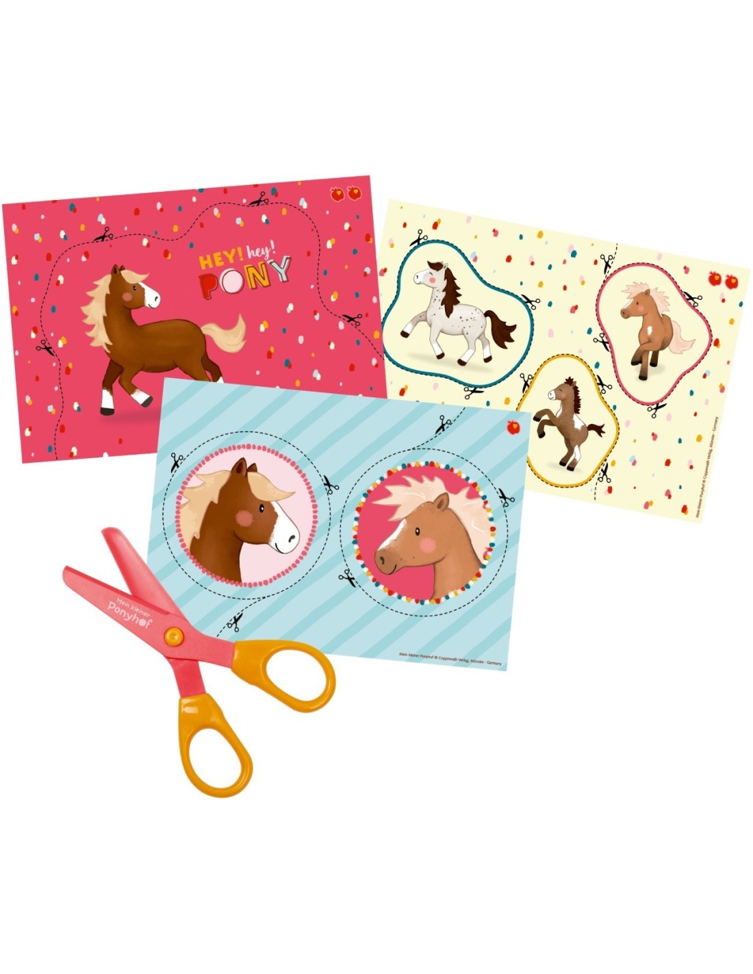 Set veiligheidsschaar voor kinderen in een schattig ponytuinontwerp en 15 snijsjablonen. De schaar is alleen geschikt voor rechtshandigen en heeft een afgeronde punt. Ze knipt alleen papier, geen huid, haar of textiel.