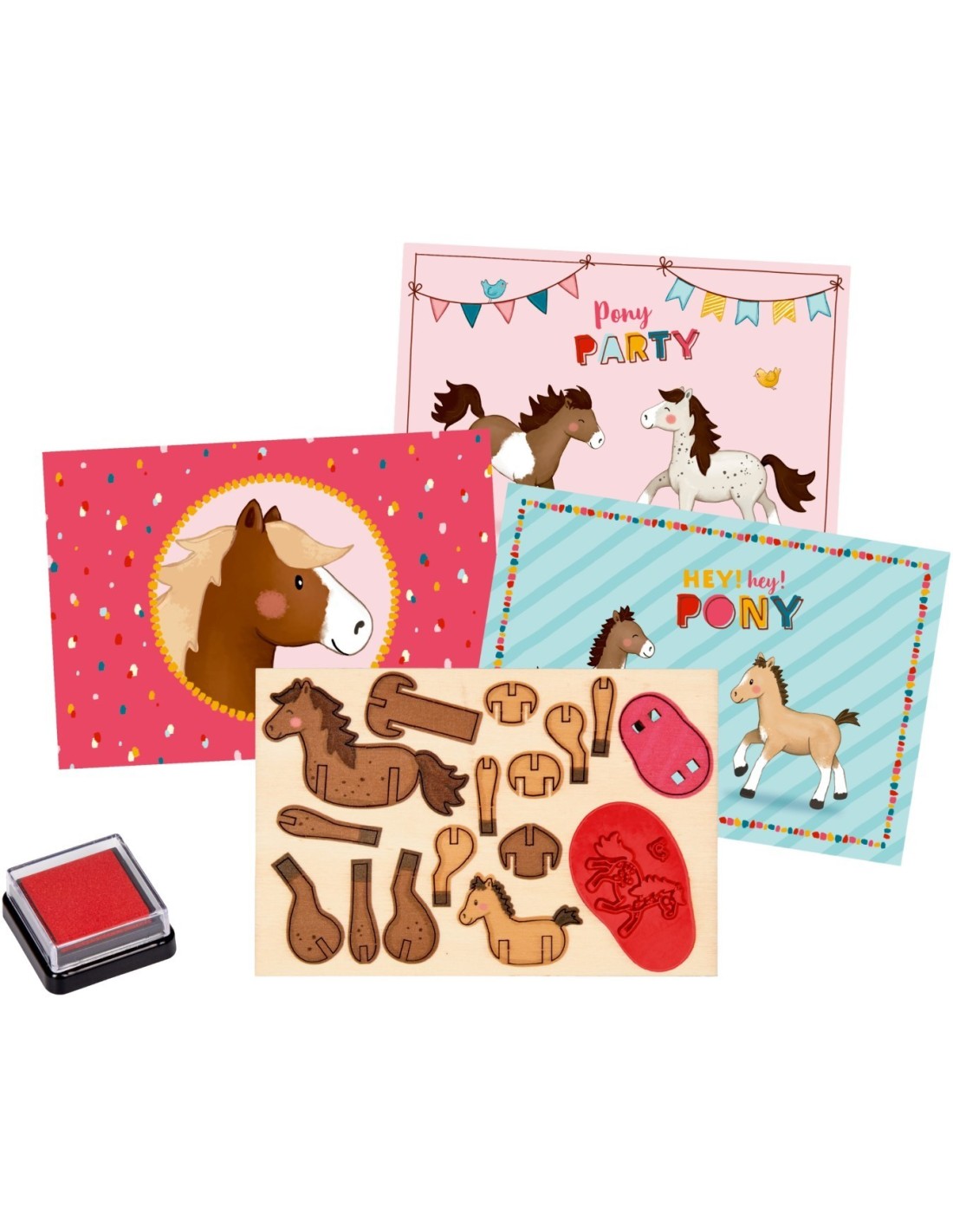 Voor knutselen en spelletjes: Met deze set kun je zelf twee schattige houten ponyfiguren samenstellen. De basis van de grotere pony wordt ook een stempel waarmee je een schattig ponymotiefje kunt stempelen. Ook inbegrepen in de set: een stempelkussen en drie ansichtkaarten.