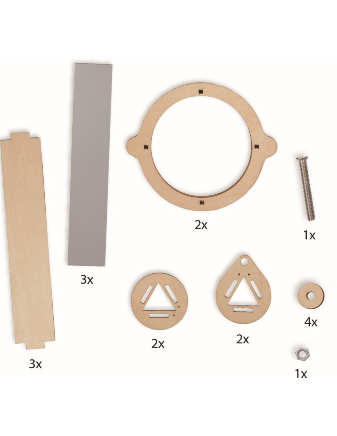 De kit bevat 3 houten strips, 3 spiegelstrips, 2 houten ringen met ringen, 6 houten verbindingsdelen, een schroef en een moer.