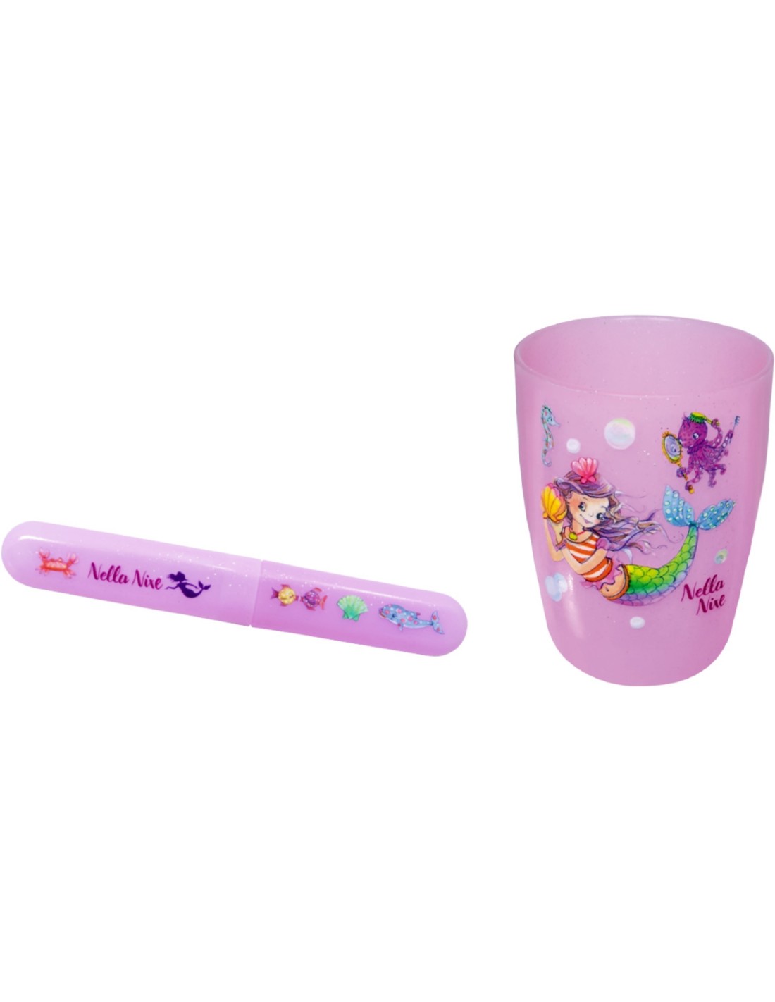 Poets je tanden met Nella Nixe! Deze glinsterende tandenborstelset maakt je een ster op het volgende nachtelijke feest. De set bestaat uit een glitterende, verfijnde tandenborstelbeker en een tandenborsteldoos in een magisch bedrukt zakje.
