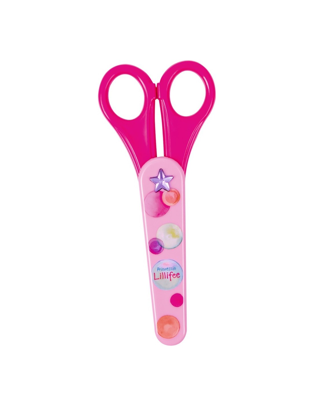 Schaar in stevige houder van prinses Lillifee met afgeronde bladen. Stevige kunststof houder met glittersteentjes. Van roestvrijstaal en kunststof. Voor rechtshandigen.