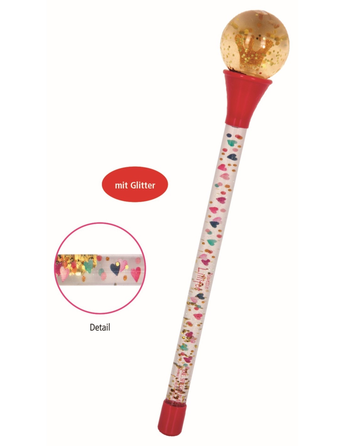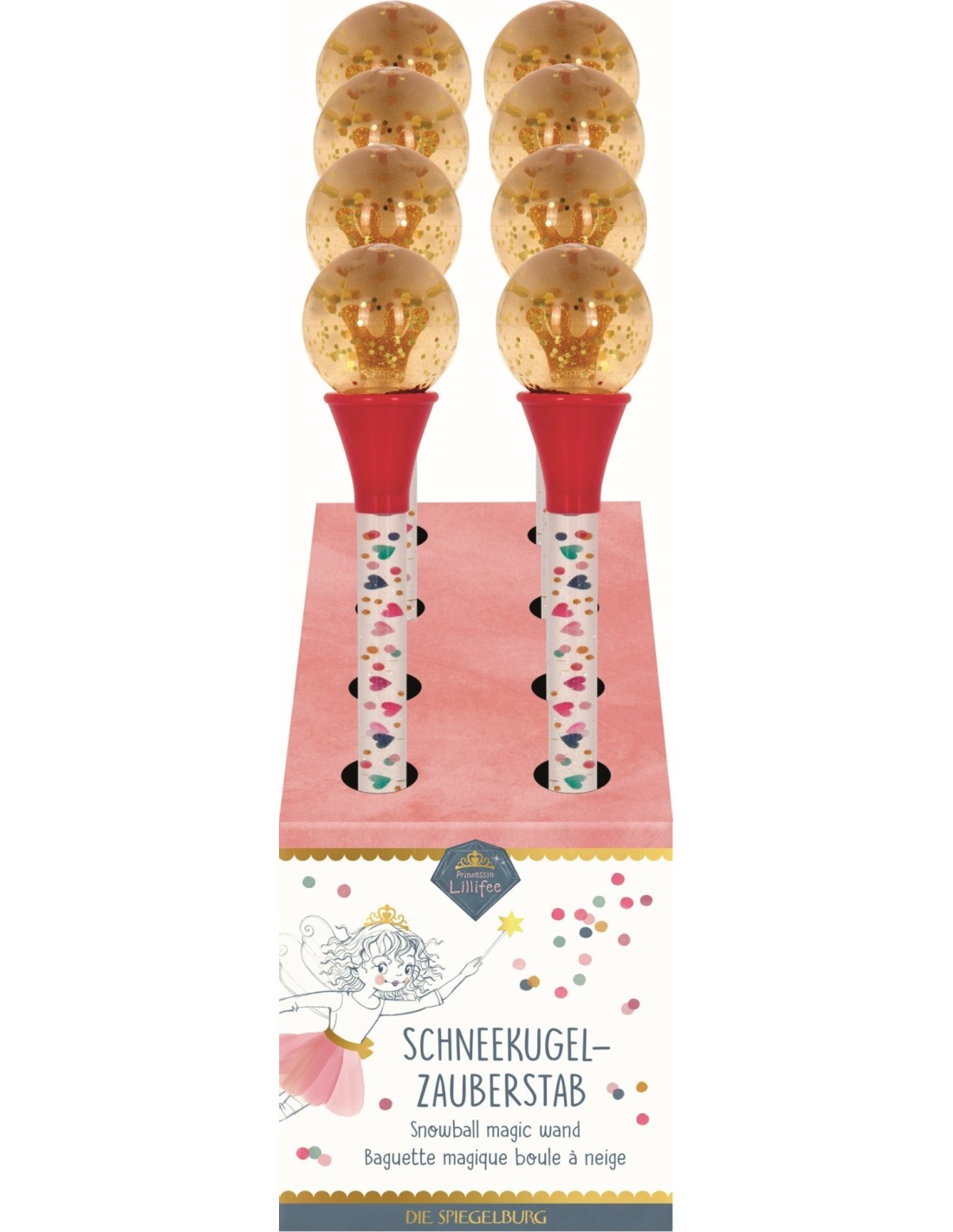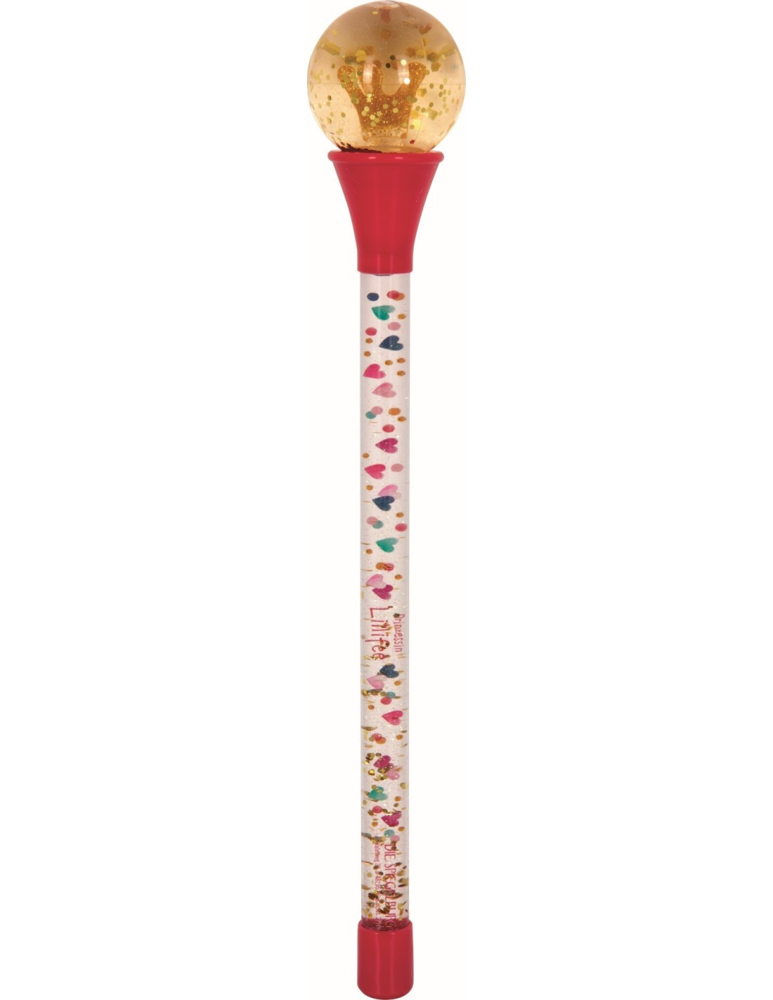 with 3-dimensional gold crown, golden confetti and iridescent glitter in the snow globe / magic wand with coloured motifs, iridescent glitter particles and gold glitter