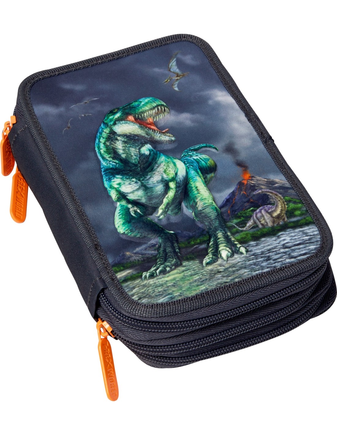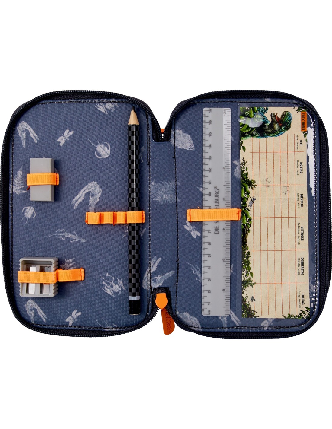StationeryPencil case with 3D-print and 3 compartments filled with timetable, pencil, ruler, eraser and sharpener