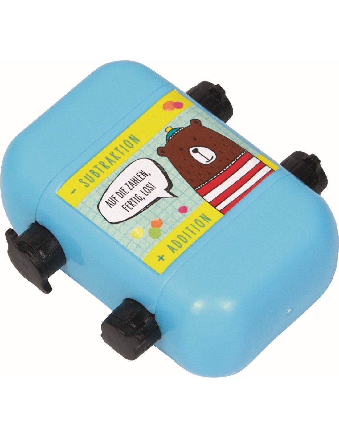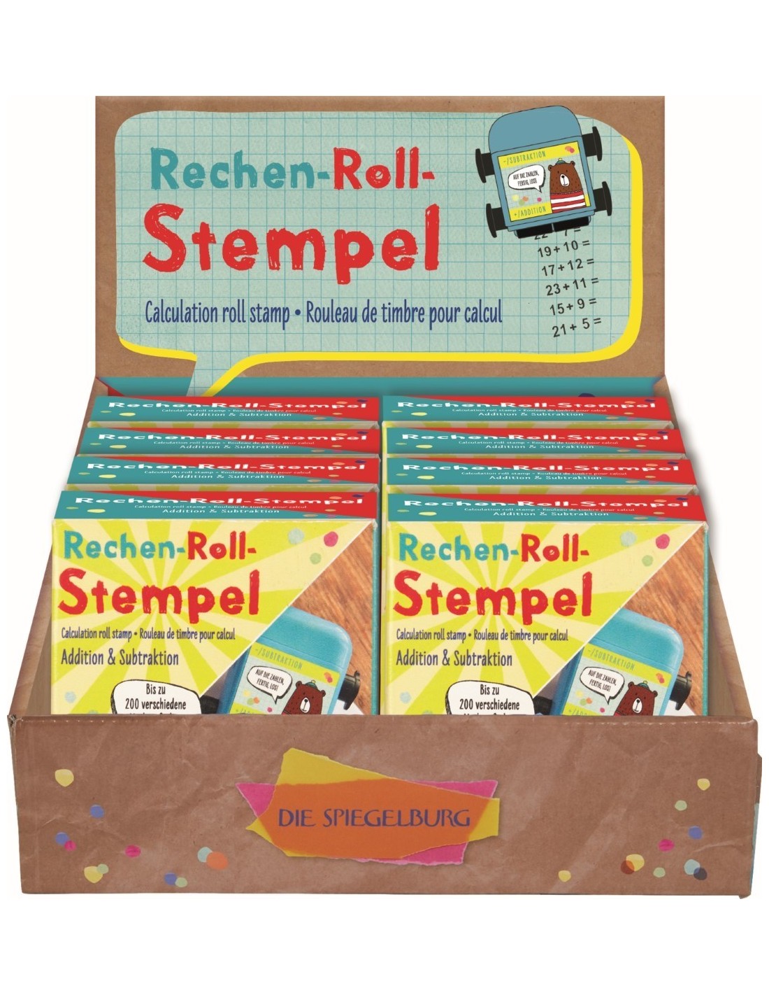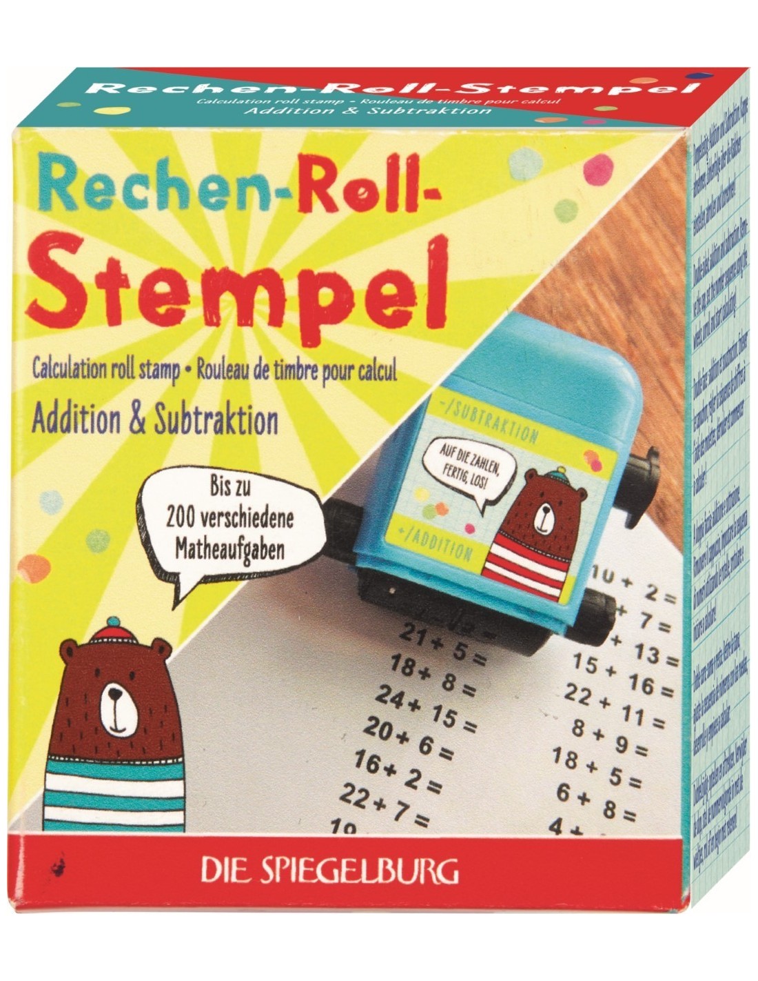 double-sided rolling stamp with maths problems / for addition and subtraction / remove the cap, set the number sequence using the wheels, unroll and start calculating