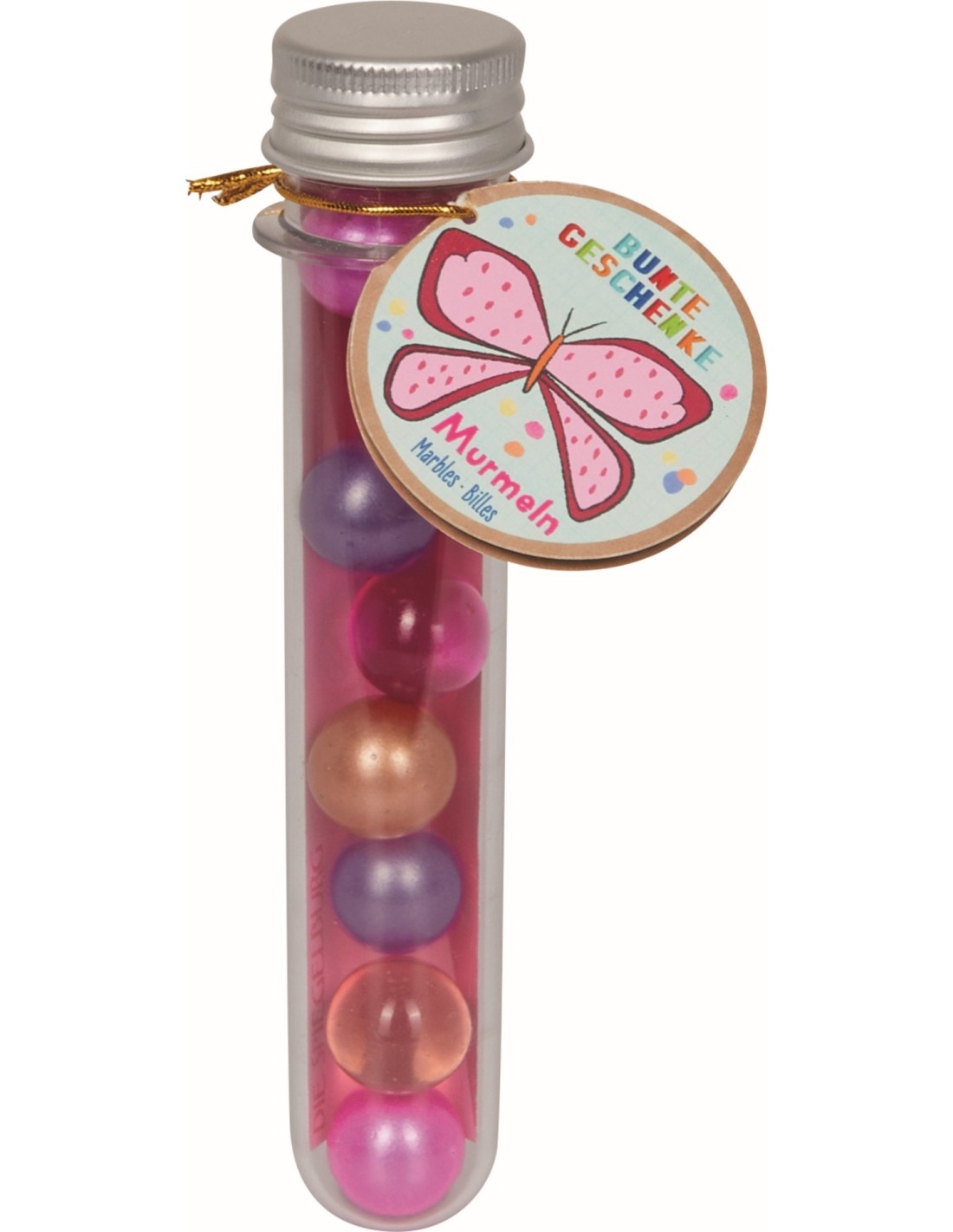 Om te spelen en cadeau te geven! De collectie "Butterfly" omvat 9 unieke glazen knikkers, elk een klein kunstwerk in glinsterende roze tinten.