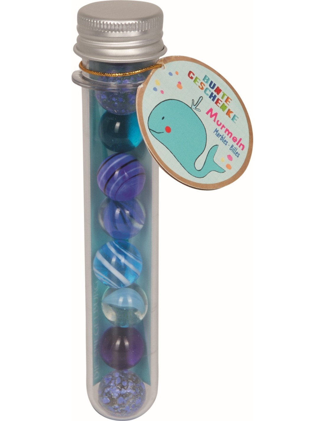 De knikkers zitten in een mooie bewaardoos, een plastic reageerbuisje.