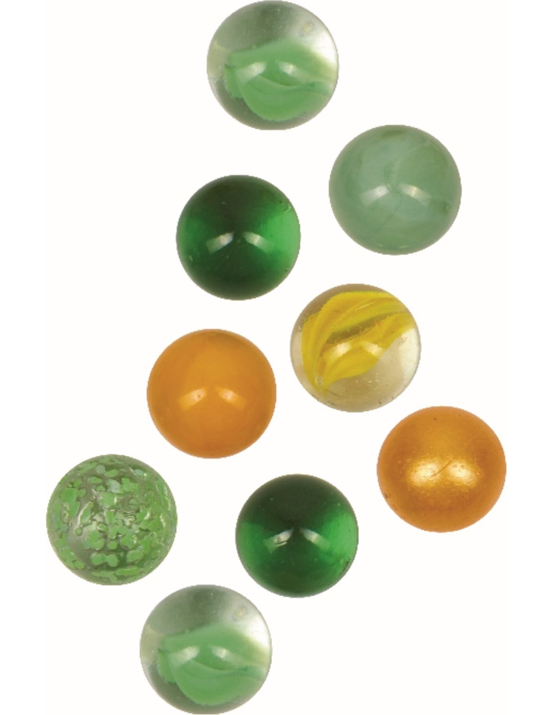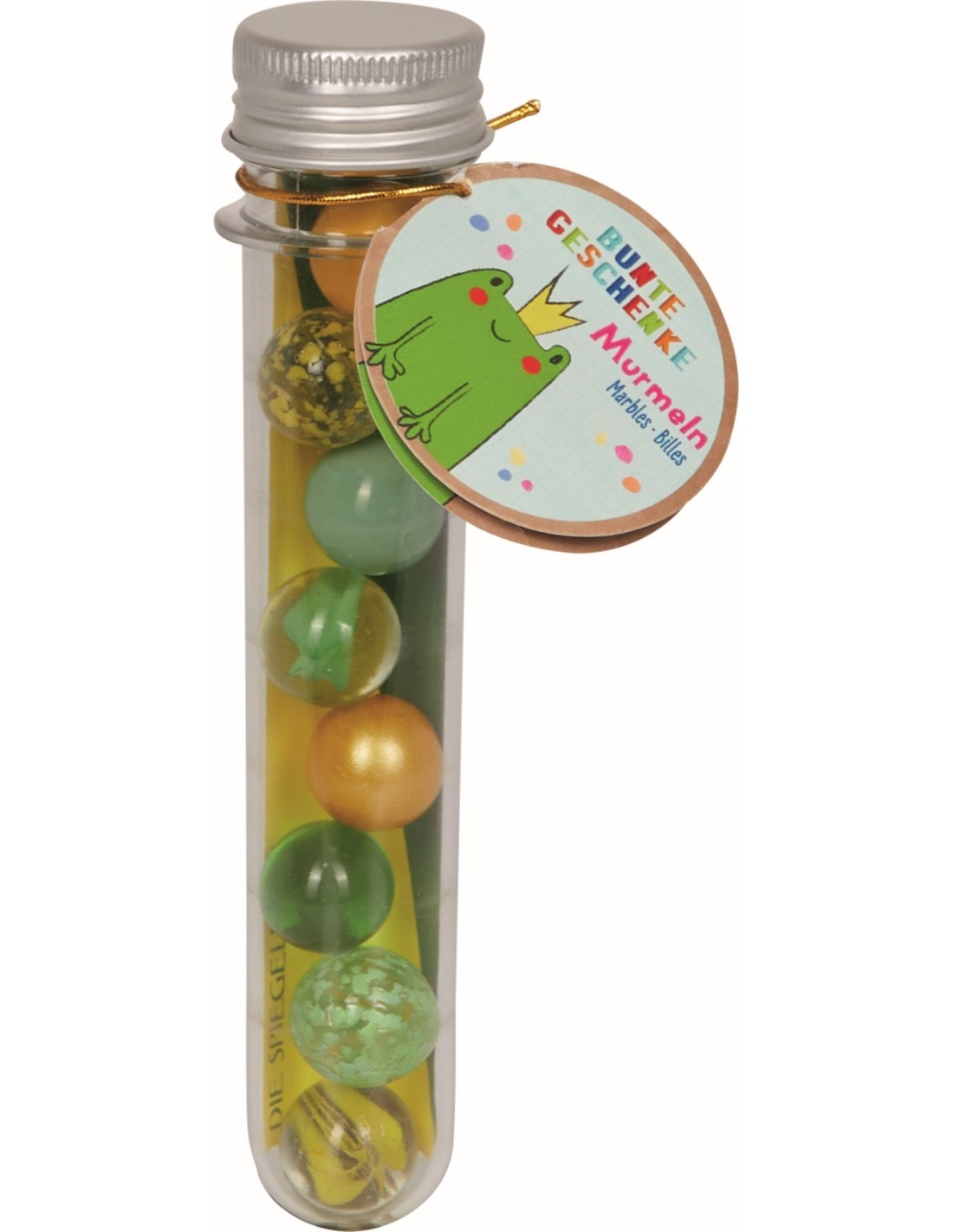 De knikkers zitten in een mooie bewaardoos, een plastic reageerbuisje.